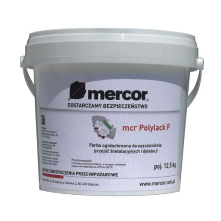 mcr Polylack F is an intumescent paint made based on antipyrines, gas-generant and carbon-generant additives, and water dispersion of synthetic resin. The paint, after applying and drying, creates a thermo-insulating foamy carbon layer on the surface heated to high temperature, which prevents burning of the polymer insulating coat at an early stage, and prevents propagation of flame along the surface of the protected insulation. The paint is sold in 12.5 kg and 6 kg buckets.