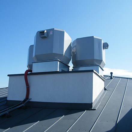 Roof smoke exhaust fans type mcr Pasat with radial rotor are designed for removing smoke and hot air from rooms during fire, and for comfort ventilation. They may feature one-speed or two-speed engines and combine comfort function with fire function, e.g. for ventilating and de-smoking underground garages, malls, production halls.