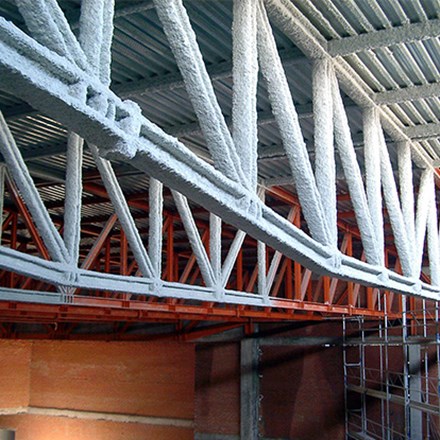 mcr Tecwool F belongs to the group of so-called fireproof light sprays, i.e. featuring small mass of the spray mass. It is designed for general land building objects, where increased fire resistance of structures exposed to standard (cellulose) fires is required.