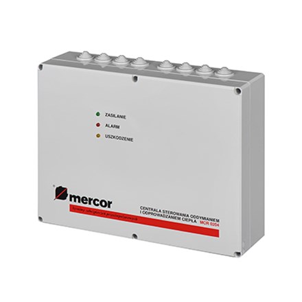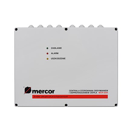 mcr 0204 desmoking control unit is a control device for electric smoke exhausting system. mcr 204 unit is used for activating electric systems of MERCOR smoke exhausting system based on alarm signal from thermal or optical smoke sensors, and manual desmoking buttons (so-called manual call point buttons). The device is supplied with 230 V~ alternating current, the output operating voltage is 24 V-. The control unit includes batteries allowing for operation of the system for 72 hours from mains voltage failure - a single alarm opening of flaps or smoke windows is possible after that time.
